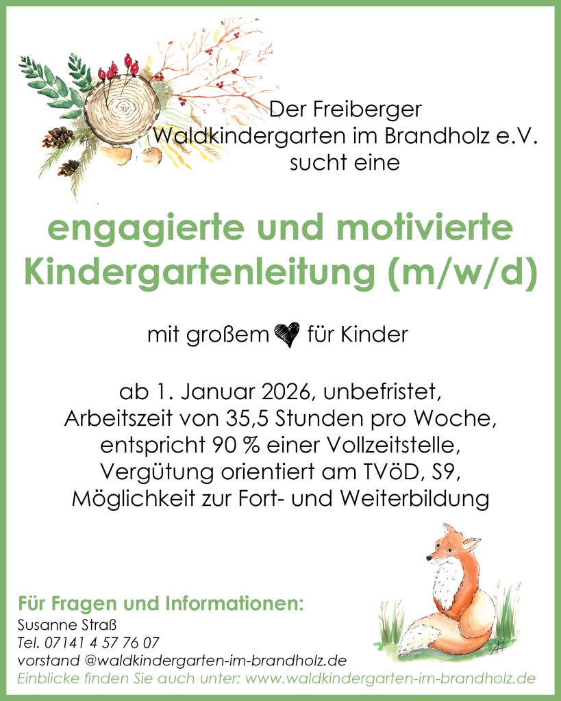 Der Freiberger Waldkindergarten im Brandholz e.V. sucht eine engagierte und motivierte Kindergartenleitung (m/w/d) mit großem Herz für Kinder.